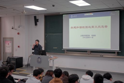 上海大学保卫处消防科科长李志春以 "共建和谐校园,远离火灾危害" 为主题,结合近年来国内外校园典型火灾案例,深入剖析了教学楼、宿舍、实验室等重点场所的火灾隐患,强调“预防为主、防消结合”的重要性。他通过触目惊心的视频与数据,警示师生关注用电安全、易燃物管理等问题,并详细讲解“四懂四会”(懂火灾危害性、懂预防措施、懂扑救方法、懂逃生路线;会报警、会灭火、会逃生、会使用消防器材)和灭火器的正确使用方法:"看压力表、摇晃、拔插销、对准火源根部喷射",并强调了陌生环境下提前识别安全出口的重要性,提醒师生摒弃侥幸心理,将消防安全融入日常,筑牢安全防线。