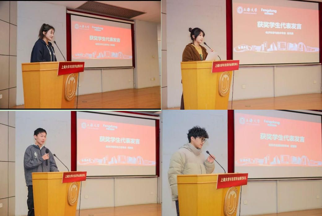 来自金属材料工程专业的张郁桐、电子科学与技术专业的倪凡雅、高分子材料与工程专业的郑皓文、无机非金属材料工程专业的夏程锋作为获奖学生代表感谢企业的慷慨捐赠,同时分享了学习心得与成长感悟,传递榜样力量。