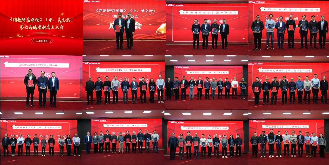 2025年12月5日,《钢铁研究学报》(中、英文版)第七届编委会成立大会在北京隆重举行。中国钢研集团副总经理、两刊主编赵栋梁、钢研总院党委书记、总经理梁剑雄莅临会议。我校材料学院翟启杰教授受邀续聘《钢铁研究学报》编委会副主任,杨健教授受聘《钢铁研究学报》英文版副主编,董瀚教授、宋长江教授、鲁晓刚教授等受邀续聘编委会成员。