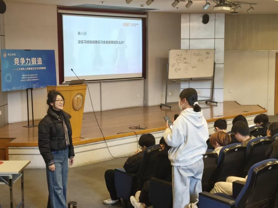 在同学们专注的聆听中,祝楠轩老师接续分享。为让职业规划方法更易理解、更具实操性,祝老师带来了大量真实案例——既有学长学姐凭借清晰规划在高端装备制造、新能源、航空航天等材料相关领域脱颖而出的成功故事,也有因定位模糊、优势未充分发挥而在职业初期遭遇困境的反思案例。通过案例剖析,祝老师详细拆解了职业规划的核心步骤,从行业调研、目标设定到路径拆解、动态调整,逐一讲解关键节点的方法技巧;同时,针对本科生可能面临的“专业学习与职业需求脱节”“实习方向选择迷茫”等常见问题,给出了具体的应对建议,让同学们对职业规划有了清晰的行动认知。