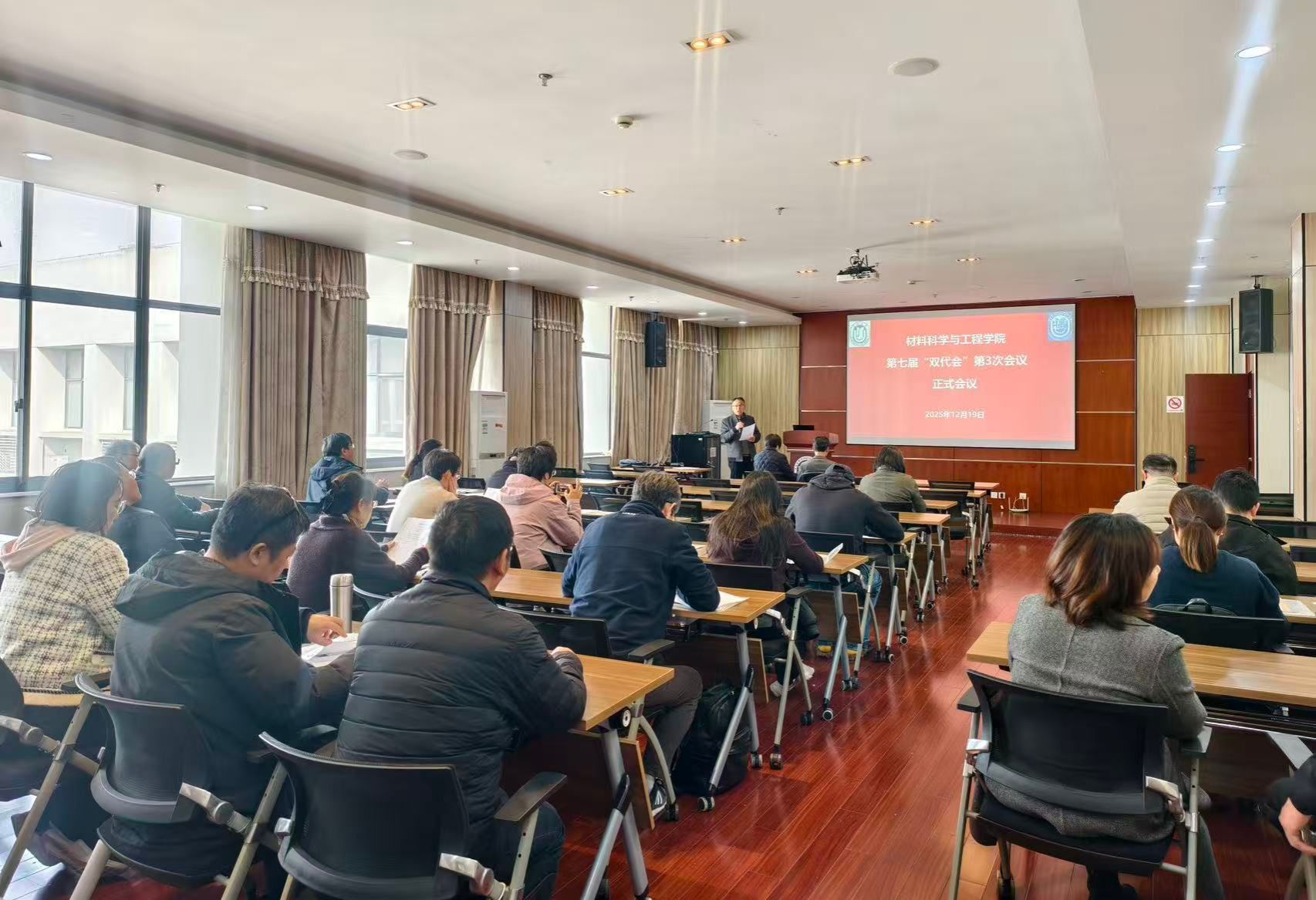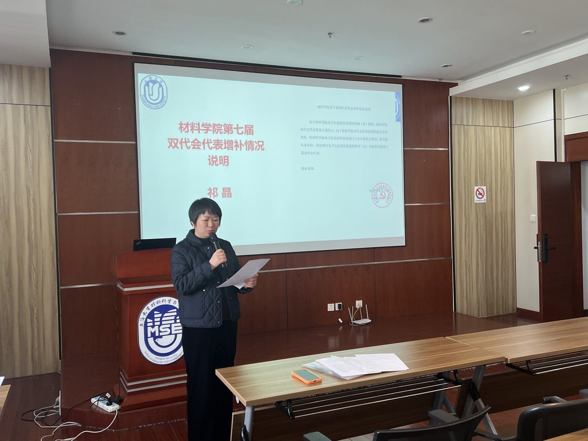 首先,由祁晶同志通报了材料学院第七届双代会代表增补情况,并就代表增补的背景、程序及结果作了详细说明,以保障代表结构的合理性与代表性,为会议顺利开展奠定坚实基础。