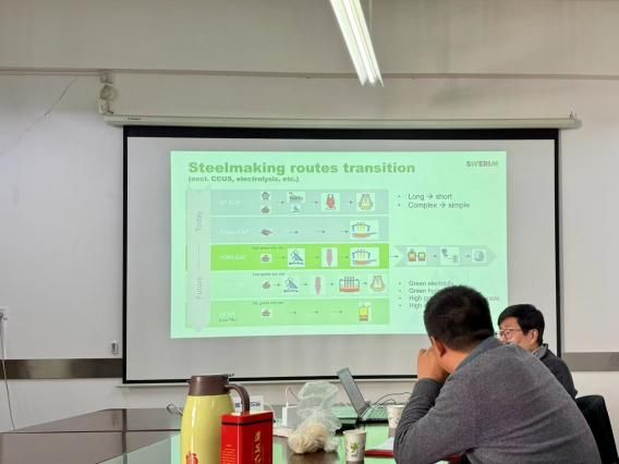 会议伊始,于要伟教授代表学院对王川教授的到来表示热烈欢迎,并介绍了他的研究背景与学术贡献。王川教授首先从全球视角介绍了钢铁行业低碳发展的整体趋势。报告提到,氢冶金、碳捕集等新技术已经在多个国家开始投入试验,北欧在球团矿冶炼、生物质利用等方面特色突出,中国在氢基炼铁、绿电炼钢等领域也取得了重要进展。
