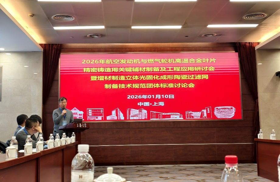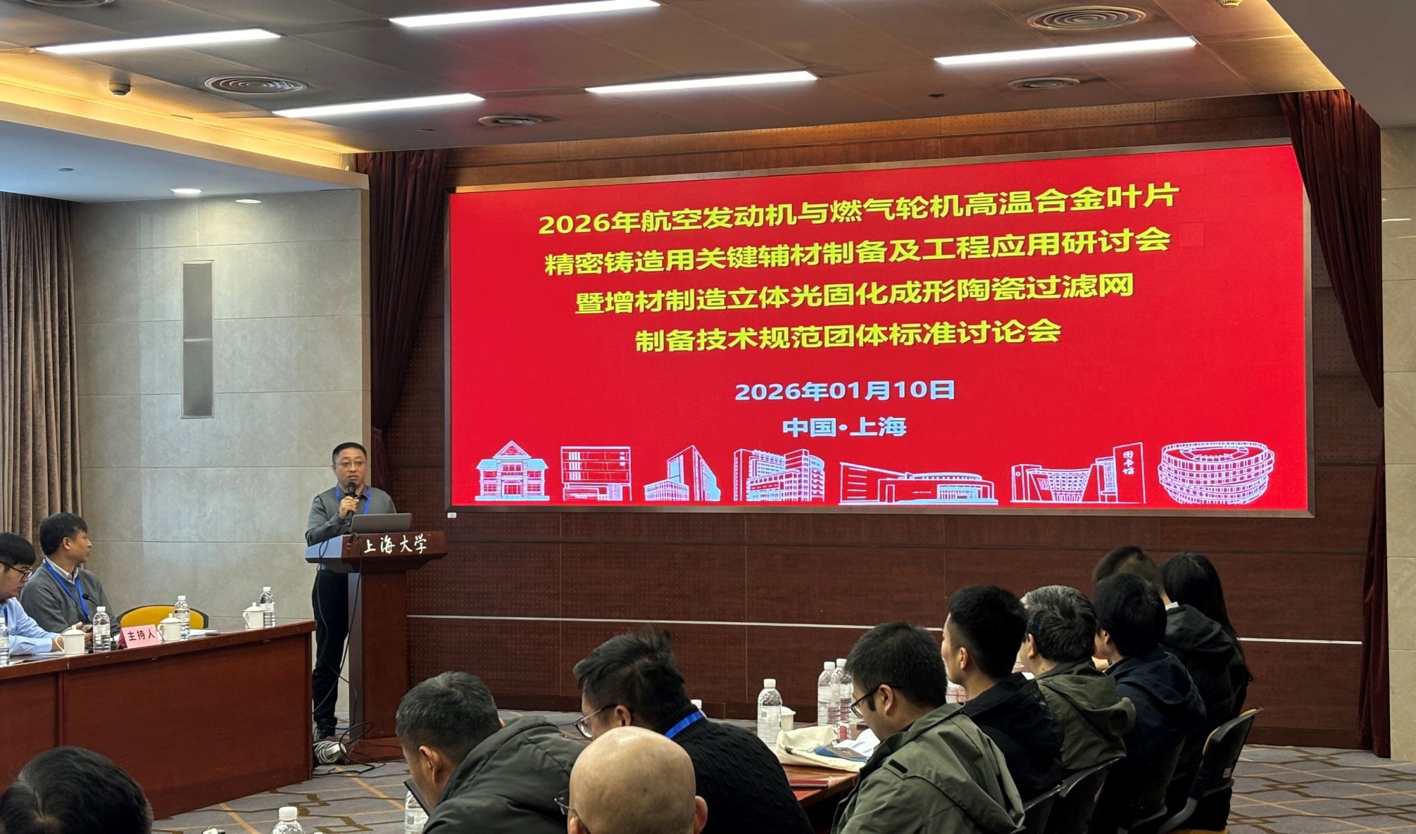 2026年1月10日,2026年航空发动机与燃气轮机高温合金叶片精密铸造用关键辅材制备及工程应用研讨会暨《增材制造·光固化成型陶瓷过滤网制备技术规范》团体标准讨论会在上海大学顺利召开。来自全国39家科研、生产和高校单位的90余位专家莅临会议,围绕关键辅材技术研发、工程应用和最新进展展开深度研讨与交流。两场会议由上海大学、中国科学院金属研究所联合主办,由上海市钢铁冶金新技术开发应用重点实验室、上海市高温材料及构件专业技术服务平台、上海大学材料科学与工程学院、上海大学卓越工程师学院、通标亿泽标准化技术服务(北京)有限公司共同承办。