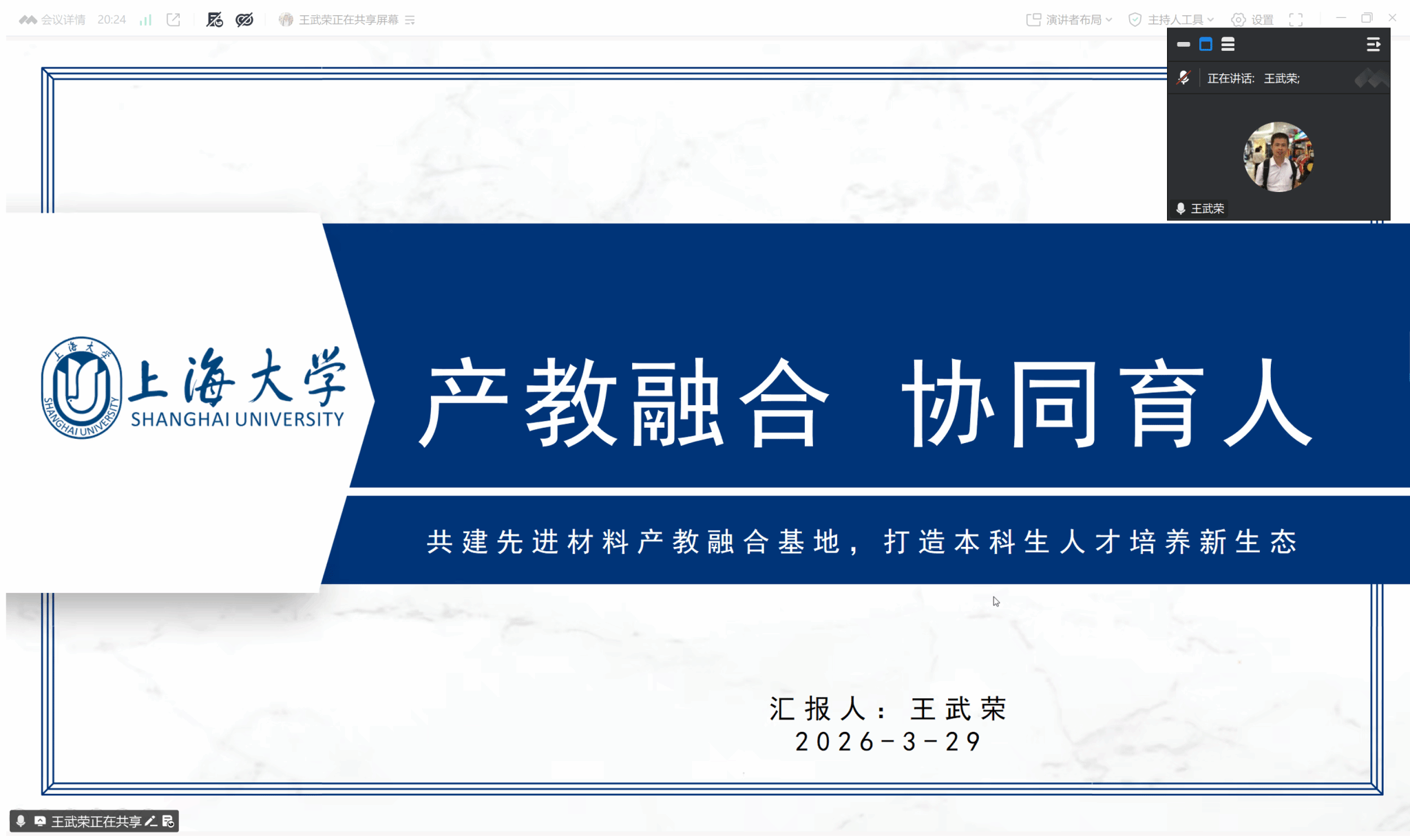 材料副院长王武荣开展题为《产教融合 协同育人》的专题汇报,系统阐述了学院先进材料卓越人才培养框架。该框架以"厚基础、强交叉、重前沿、融产教"为培养目标,依托徐匡迪、周邦新、孙晋良、刘昌胜、张统一等院士领衔的钢铁冶金、核电材料、复合材料、生物材料及材料基因五大特色方向,整合冶金工程、材料科学与工程等优势学科资源,构建"贯通本硕博"进阶式课程体系。学院创新推出"工程思维课""实物教学课""产线连线课""诊断式课堂"等八种产教融合课堂形式,将企业真实项目、失效案例与内控标准引入教学,依托多个国家级重点实验室及"111"引智基地,致力于培养能够直面产业真问题、引领行业发展的先进材料卓越工程师。