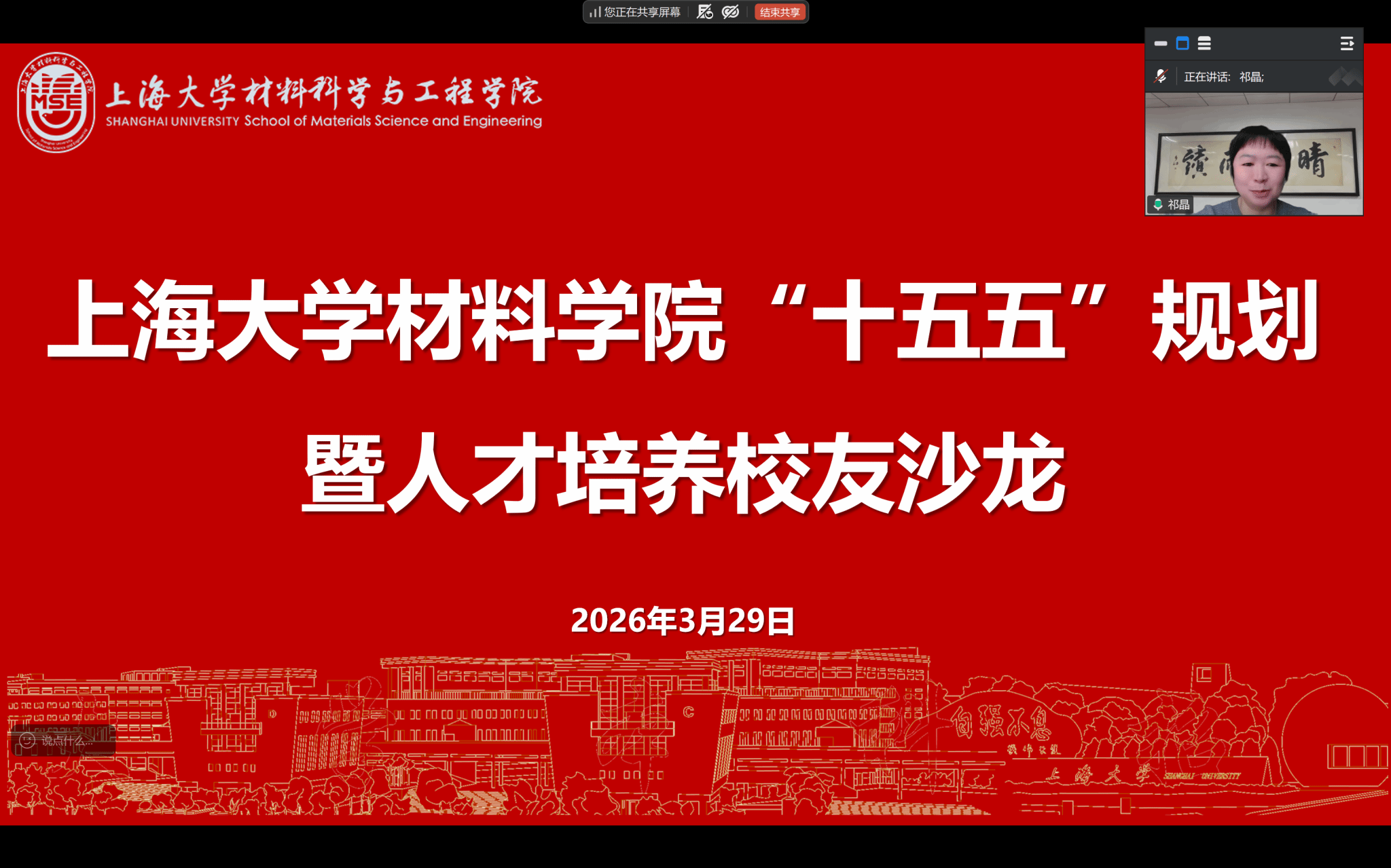 2026年3月29日上午10点材料学院举办"十五五"规划暨人才培养线上校友沙龙。学院党委书记黄健,副书记、副院长祁晶,副院长王武荣与多位校友和教师线上相聚,围绕人才培养质量提升、校企合作深化、学院高质量发展等议题展开深入交流,为学院未来发展集思广益、凝聚共识。沙龙由祁晶副书记主持。