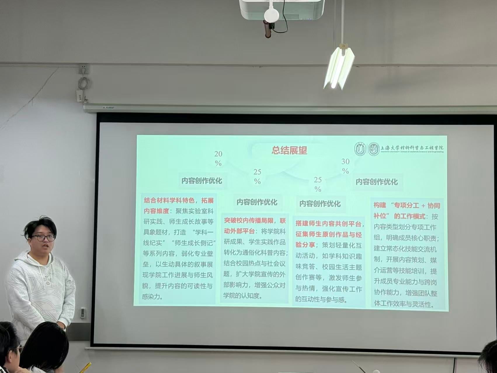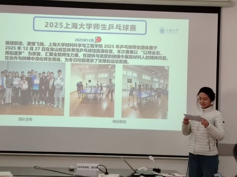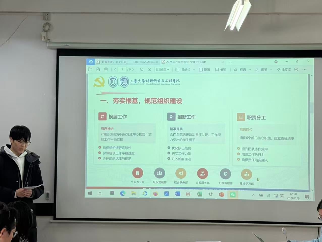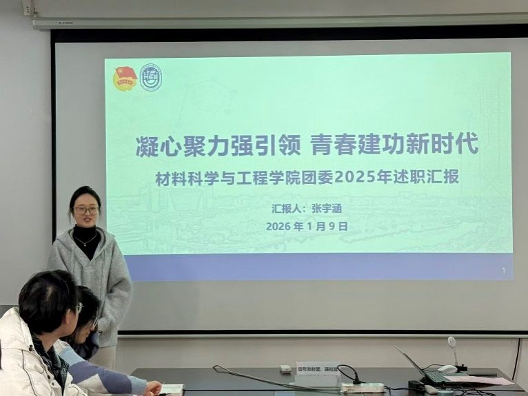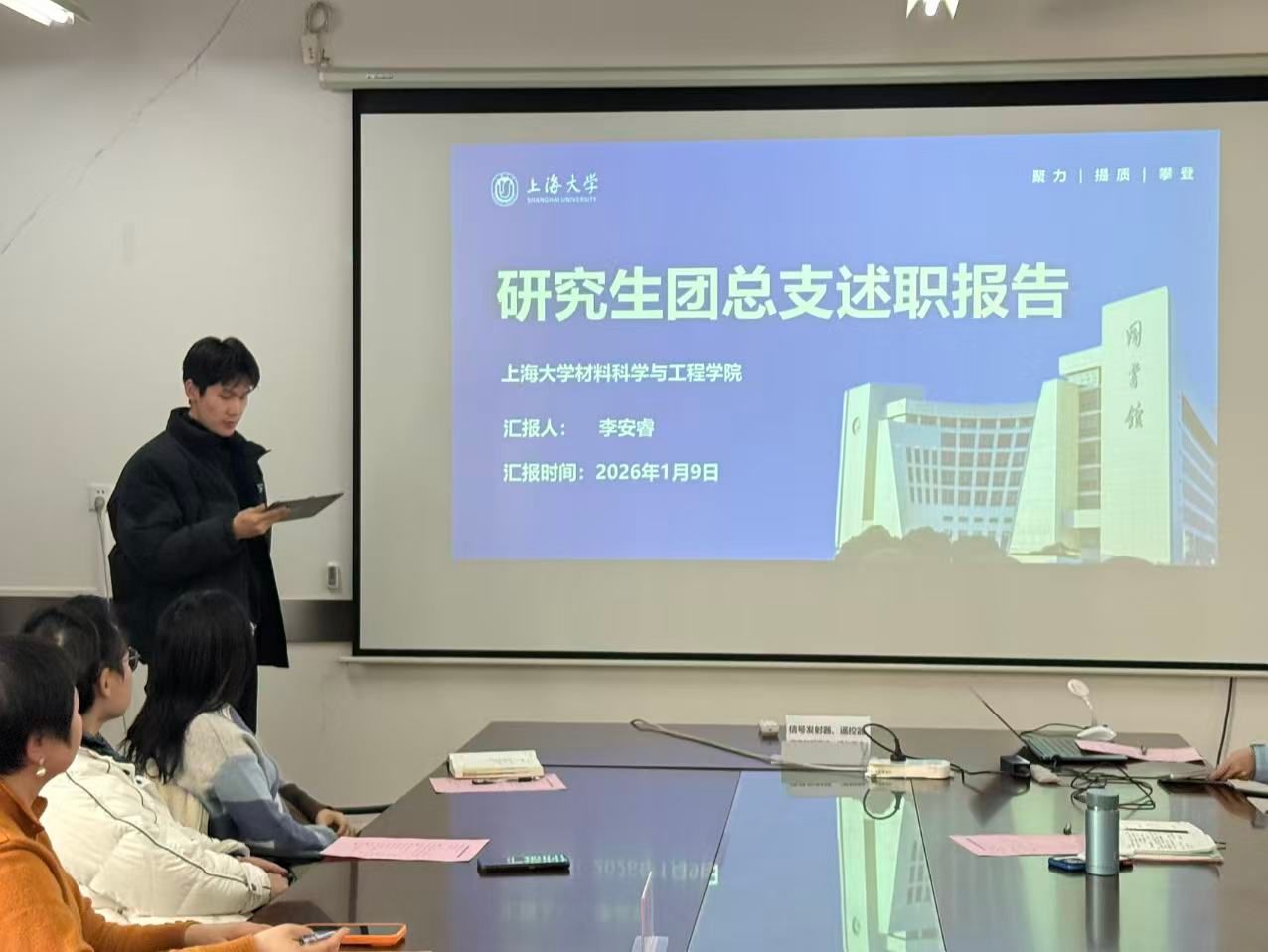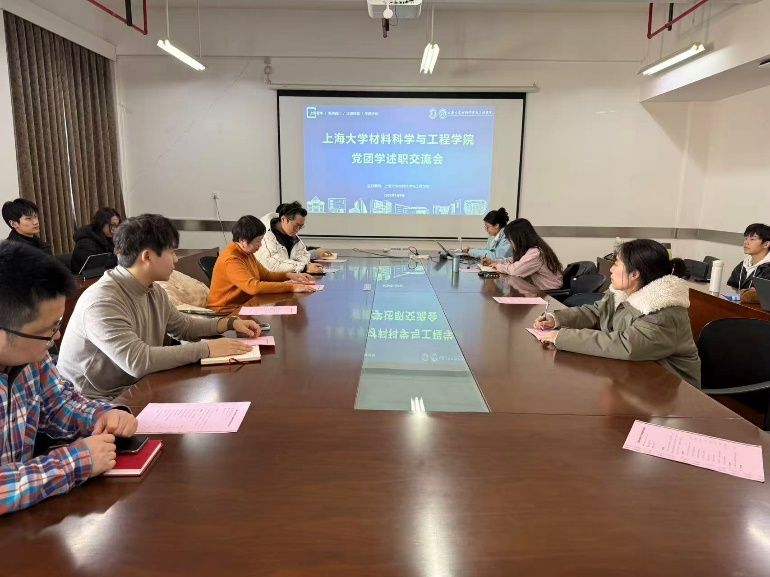 2026年1月9日中午,上海大学材料科学与工程学院在东区8号楼508会议室召开2025年党团学述职交流会。学院党委副书记、副院长祁晶,团委书记夏侯照,各学生组织指导老师及学生骨干齐聚一堂,总结过往,展望未来。会议由朱淑淇同学主持。