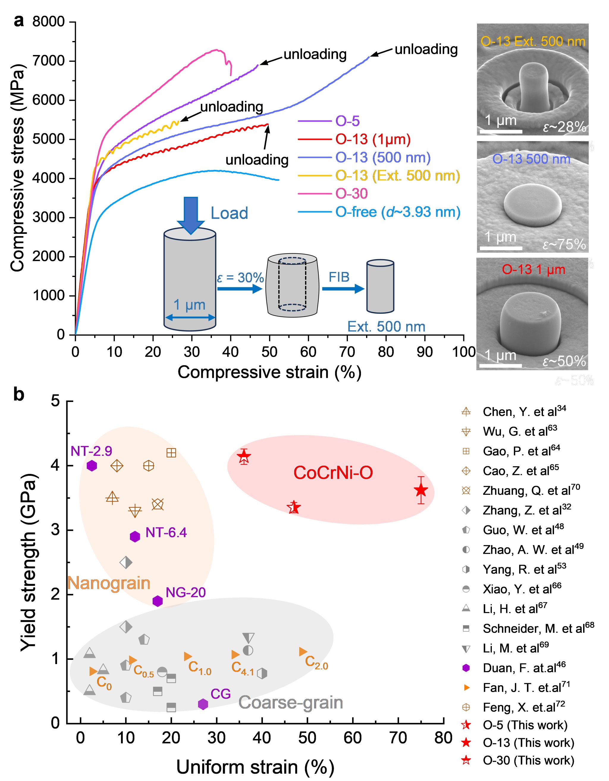 得益于这一独特的“氧纳米团簇”结构,该3纳米晶粒尺寸的合金同时实现了约3.6 GPa的超高屈服强度和超过50%的均匀压缩塑性,成功规避了“反霍尔-佩奇软化”,其综合性能显著优于目前已报道的各类面心立方纳米金属材料,突破了当前金属材料的强塑性极限(图2)。更重要的是,该策略在FeCrNi-O和HfNbTiZr-O等多种合金体系中均展现出良好的普适性,证实了“氧纳米团簇”可作为一种通用的纳米材料强韧化设计新范式。