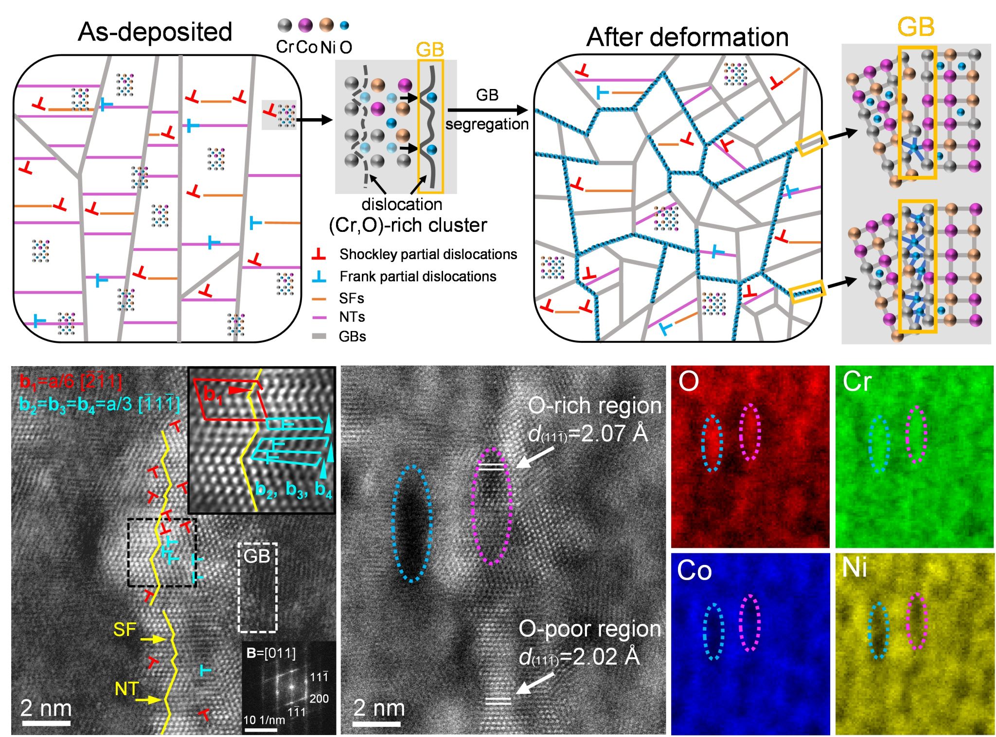 研究团队独辟蹊径,选择CoCrNi中熵合金为基体,采用磁控溅射技术引入大量间隙氧原子,成功制备出平均晶粒尺寸仅为3纳米的(CoCrNi)87O13模型合金。研究发现,氧原子在合金中并非均匀分布或形成脆性氧化物,而是自发形成了纳米尺度的富(Cr, O)团簇。这些富氧团簇通过“晶内-晶界”联动机制,同步提升强度与韧性:一方面,晶内团簇通过钉扎位错并促进其增殖,实现强化;另一方面,氧原子在变形中被拖曳至晶界富集,通过增强键合并降低晶界能来稳定界面,从而抑制了晶粒粗化、晶界滑移及剪切带的形成,实现韧化(图1)。